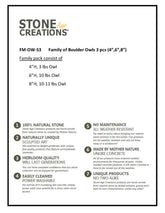 This adorable Family of Boulder Owls would be a great addition around your garden or in your home. They also make perfect gifts! They are made from Natural Granite Boulder with hand carved accents and smooth features. Since each boulder pet is hand carved it is unique in shape and color. This 3 piece set includes a 4" 1.5-2.5lb, 6" 8-9lb, & 8" 10-11lb Boulder Owl. Height and weight are approximate.