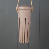 This unique Peanut Bird Feeder is made with Nut Husks. The Earthy Sustainable line processes agricultural waste blending it with resin. A lot of time energy and water goes into growing crops yet most of the plant goes unwanted and would normally be burnt releasing harmful CO2 into the environment. Instead the waste material is processed to create Earthy sustainable products. None of the ingredients are grown specifically for Earthy. The unwanted parts of commercially-farmed crops are used to make our feeders. These products are frost proof and suitable for outdoor and indoor use. Lifespan 2-3 years. Dimensions are 9.25" x 3.25"Dia.