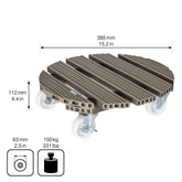 Wagner Waterproof Large Round Plant Caddy is beautiful and extremely durable! Neutral taupe color goes well with any decor. Made of Wood Plastic Composite it is water and uv-resistant so it can be used indoors or out! Equipped with heavy-duty smooth rolling caster wheels. 25-year guarantee. The Wagner company located in southern Germany near the Black Forest has earned a reputation for exceptional quality. With over 40 years experience in design and manufacturing their products are rigorously tested for quality safety and durability. 330lbs. capacity 15.1"D x 4.5"H 4.85lbs