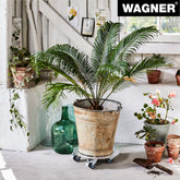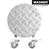 Wagner Round Aluminum Plant Caddy in a fresh contemporary design. Equipped with soft equipment casters providing protection on all surfaces won't scratch or mar floors. Two casters are fitted with a strong brake for easy and safe positioning. Surface design prevents pots from slipping. Use indoors or out. Made in Germany. The Wagner company located in southern Germany near the Black Forest has earned a reputation for exceptional quality. With over 40 years experience in design and manufacturing their products are rigorously tested for quality safety and durability. 220 lbs. capacity 11.8"D x 2.75"H 2.2 lbs.
