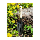 The DeWit Slotted Hand Trowel makes garden tasks quick and effortless. Sharpened from side to side it is ideal for digging cutting through roots and eliminating weeds. Works like a standard trowel with an added feature - the slots in the tool are used to sift out rocks and roots for easy removal. Great for tough soil and clay. A great tool to mix soil with fertilizer when planting. Made from hardened boron steel and heat-treated for strength it is the perfect gardening companion. Handle is made of hardwood ash and harvested from environmentally responsible FSC-certified forests. Manufactured in Holland this tool is guaranteed a lifetime! Head: 6.3"L x 3"W Total: 13"L 0.5lbs