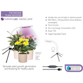 Boosts growth with 20 high intensity red/blue LEDs. 7W power. 400-700 nm Photosynthetic Active Radiation wavelengths. Blue light boosts foliage ensure plants absorb more energy through the synthesis of chlorophyll stimulating germination red light promotes flowering enhances photosynthesis and red/blue combination speeds up growth. Spectacular results - plants think it's June all year round! Low power consumption less than 2 cents per day. Attractive height adjustable white tripod. Timer function for unattended use - 3/9/12 hours. Universal USB connector. Suitable for all house plants: flowers foliage herbs succulents. The base of the tripod is 7.25" tall. The adjustable neck is 13.25" and the LED light section is 5.5". 1 lbs.