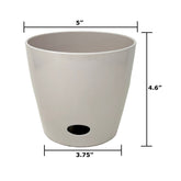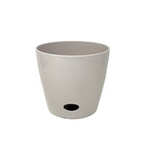 Worlds first Bamboo Fiber self-watering pot this 5" Cream Solid Round self-watering pot is made from sustainable biodegradable all natural Bamboo Fiber and corn starch. Plants thrive in this natural Bamboo Fiber pot that is plastic free. The soil is better aerated by the unique water well in the base allowing better nutrient management helping the plants grow healthy and strong. These pots should be treated like ceramic suitable for use in hot or cold climates inside or outside. At initial planting water from the top until water is just below the overflow. Then periodically check the water level in the base and add water to the well from the bottom access or from the top of the pot. The soil draws water up from the well as needed using capillary action just like a wick. No more overwatering strong healthy plants is the result! Everyone gets a "green thumb" growing in bamboo pots and just by keeping water in the well! When you are finished with your pot just break it up and put into your compost bin. Over time the material will degrade back to nature.